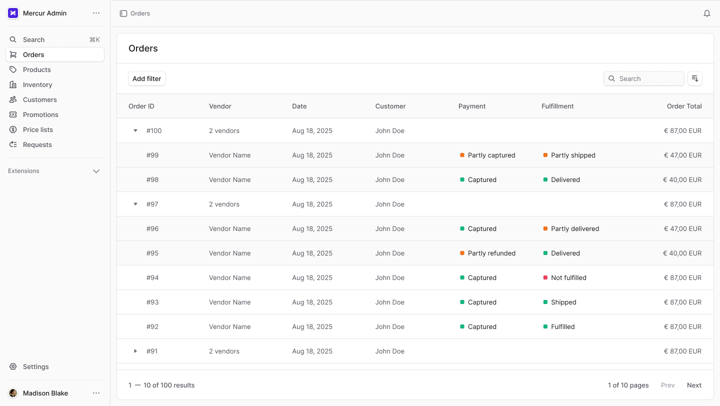 Mercur, our marketplace platform, is built for companies running multi-vendor marketplaces. The platform covers seller onboarding, catalog tools, payouts, order orchestration, analytics, and the integrations marketplace operators rely on. The structure of its modules reflects what most marketplaces need once they go beyond early experiments and start dealing with higher-order volumes, more sellers, and a growing catalog.